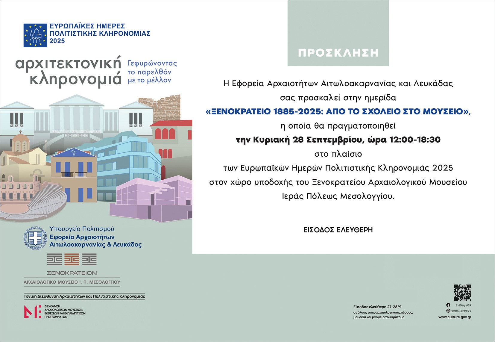 «Αρχιτεκτονική Κληρονομιά – Γεφυρώνοντας το παρελθόν με το μέλλον» είναι ο τίτλος εορτασμού για το έτος 2025 της επετειακής δράσης «Ευρωπαϊκές Ημέρες Πολιτιστικής Κληρονομιάς», υπό τον συντονισμό της Διεύθυνσης Αρχαιολογικών Μουσείων, Εκθέσεων και Εκπαιδευτικών Προγραμμάτων του Υπουργείου Πολιτισμού. Η Εφορεία Αρχαιοτήτων Αιτωλοακαρνανίας και Λευκάδος συμμετέχει στον εορτασμό, διοργανώνοντας τις εξής δράσεις: Παρασκευή 26 Σεπτεμβρίου: Το νέο εκπαιδευτικό πρόγραμμα της ΕΦΑΑΙΤ «Πάμε θέατρο στους Οινιάδες;» ανοίγει την αυλαία του στο αρχαίο θέατρο Οινιαδών. Απευθύνεται σε μαθητές της Ε΄ και Στ΄ τάξης του Δημοτικού Σχολείου. Οι συμμετέχοντες, αφού ξεναγηθούν στο πρόσφατα αναστηλωμένο αρχαίο θέατρο Οινιαδών, θα αξιολογήσουν γνωστικά την εμπειρία τους μέσω εκπαιδευτικού εντύπου, εστιάζοντας βιωματικά στα αρχιτεκτονικά μέρη ενός αρχαίου θεάτρου, στους συνοδούς του θεού Διόνυσου, αλλά και σε τοπικούς μύθους, που ενέπνευσαν αρχαίους συγγραφείς. Η παραγωγή του εντύπου εντάσσεται στο έργο «Στερέωση, αποκατάσταση και ανάδειξη αρχαίου θεάτρου Οινιαδών», που υλοποιήθηκε από την Εφορεία Αρχαιοτήτων Αιτωλοακαρνανίας και Λευκάδος μεταξύ των ετών 2020-2023 και χρηματοδοτήθηκε από το Ε.Π. Δυτική Ελλάδα 2014-2020. Το εν λόγω πρόγραμμα αποτελεί πλέον ένα από τα σταθερά εκπαιδευτικά προγράμματα της Εφορείας για το διδακτικό έτος 2025-2026 και προσφέρεται δωρεάν. Απαραίτητη η δήλωση συμμετοχής: τηλ. 26310-26068, mail: efaait@culture.gr Πληροφορίες Μ. Γαβρίνα *Σε περίπτωση που η ημερομηνία 26/9 δεν εξυπηρετεί, λόγω της 12ης Πανελλήνιας Ημέρας Σχολικού Αθλητισμού, το πρόγραμμα μπορεί να υλοποιηθεί την Δευτέρα 29 Σεπτεμβρίου. Ναύπακτος 26 και 27 Σεπτεμβρίου: Δράση: «Τα Σπίτια Μιλούν-Μνήμες σε Κώδικα». Η δράση «Τα Σπίτια Μιλούν – Μνήμες σε Κώδικα» αποτελεί μια ψηφιακά υποστηριζόμενη περιπατητική εμπειρία, αφιερωμένη στην ανάδειξη της αρχιτεκτονικής κληρονομιάς της πόλης της Ναυπάκτου. Εστιάζει σε βυζαντινά και μεταβυζαντινά μνημεία αρμοδιότητας της Εφορείας Αρχαιοτήτων Αιτωλοακαρνανίας και Λευκάδας, αλλά σύμφωνα με το πλαίσιο των Ευρωπαϊκών Ημερών Πολιτιστικής Κληρονομιάς και σε άλλα κτήρια, που έχουν ιστορικό, αισθητικό και κοινωνικό ενδιαφέρον για την πόλη της Ναυπάκτου. Στο πλαίσιο της δράσης θα γίνει αναφορά στις υποδομές της πόλης, στην ρυμοτομία της, και σε σημεία ιδιαίτερου ιστορικού ενδιαφέροντος, όπως σε προτομές ευεργετών και ιστορικών προσώπων. Σε κάθε στάση της περιπατητικής διαδρομής, με τη βοήθεια των οργανωτών, οι επισκέπτες θα μπορούν να ανακαλύπτουν προφορικές μαρτυρίες, φωτογραφίες, μικρά βίντεο και ηχητικά αρχεία, που αναδεικνύουν τη μνήμη και τις ιστορίες, που φέρουν τα κτήρια αυτά. Περιγραφή δράσης: Εντοπισμός και επιλογή κτηρίων με ιστορικό και αρχιτεκτονικό ενδιαφέρον στη Ναύπακτο. Ενδεικτικές στάσεις της διαδρομής στα εξής κτήρια και μνημεία α) τείχη Κάστρου Ναυπάκτου 4ου και 5ου διαζώματος (εντός του παραδοσιακού οικισμού), β) Βεζίρ τζαμί, γ) Οθωμανικά λουτρά, δ) Αρχοντικό Τζαβέλλα (έδρα ΕΦΑΑΙΤ Ναυπάκτου), ε) Ρολόι, στ) Κρήνες οθωμανικές και νεότερες, ζ) Αρχοντικό Μπότσαρη, η) Αγ. Δημήτριος, θ) Δημαρχείο ι) Παπαχαραλάμπειος Βιβλιοθήκη. Οι συμμετέχοντες θα ακολουθούν τη διαδρομή μέσα από ψηφιακό χάρτη, ενώ με το πέρας της εκδήλωσης θα δημιουργηθούν μόνιμα QR codes που θα συνδέουν το κοινό με μικρής διάρκειας βίντεο (1-2 λεπτά) που θα περιέχουν ηχητικές α